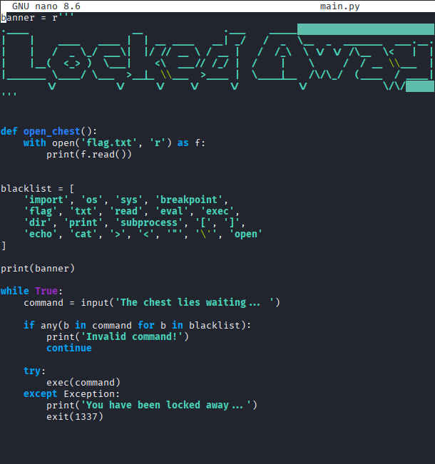 Basically any input that gets evaluated by the exec(command) function will just repeat the The chest lies waiting... string until you find a valid way to pull the flag... simply a puzzle box kind of challenge but within the realm of Python.